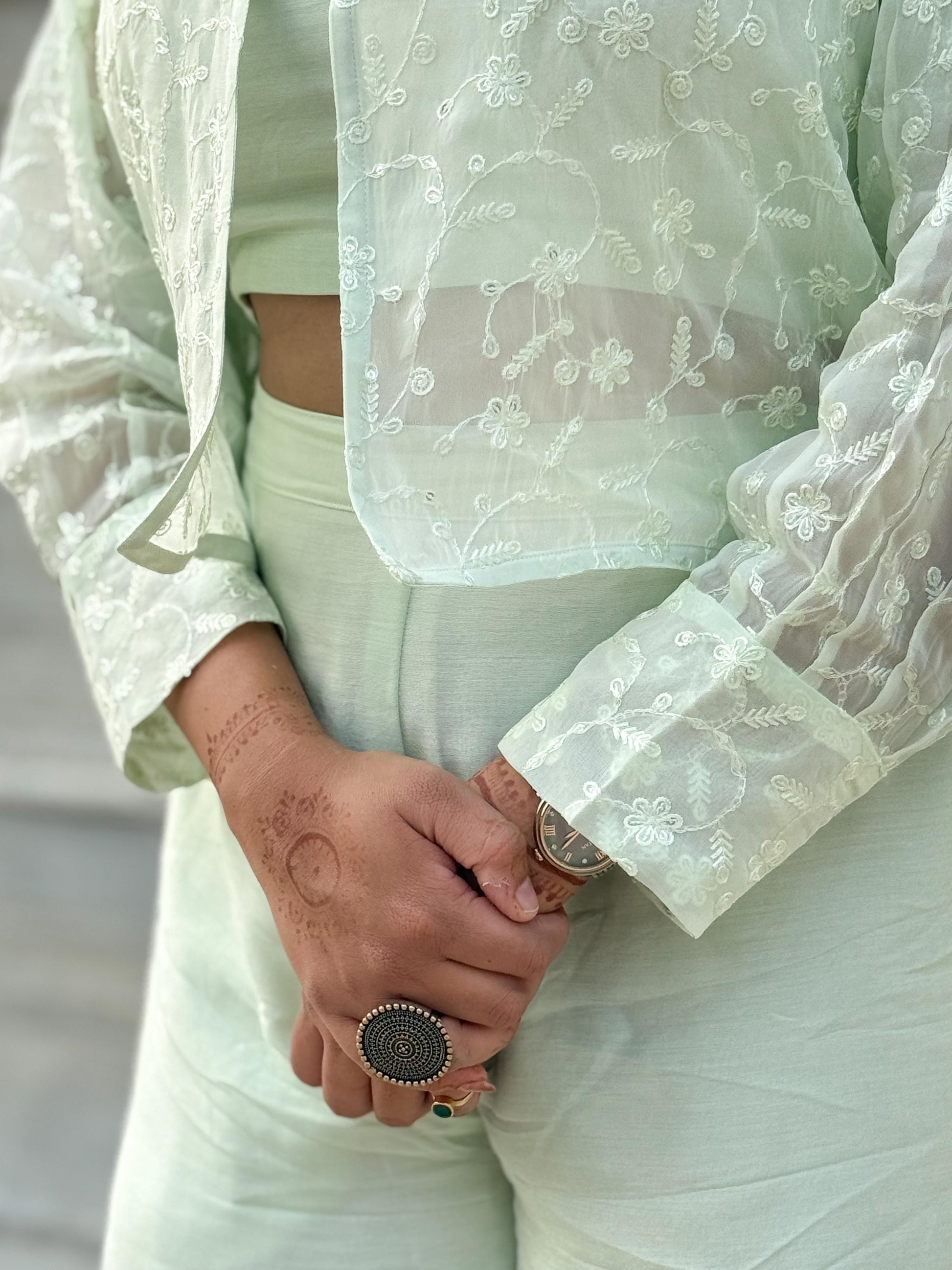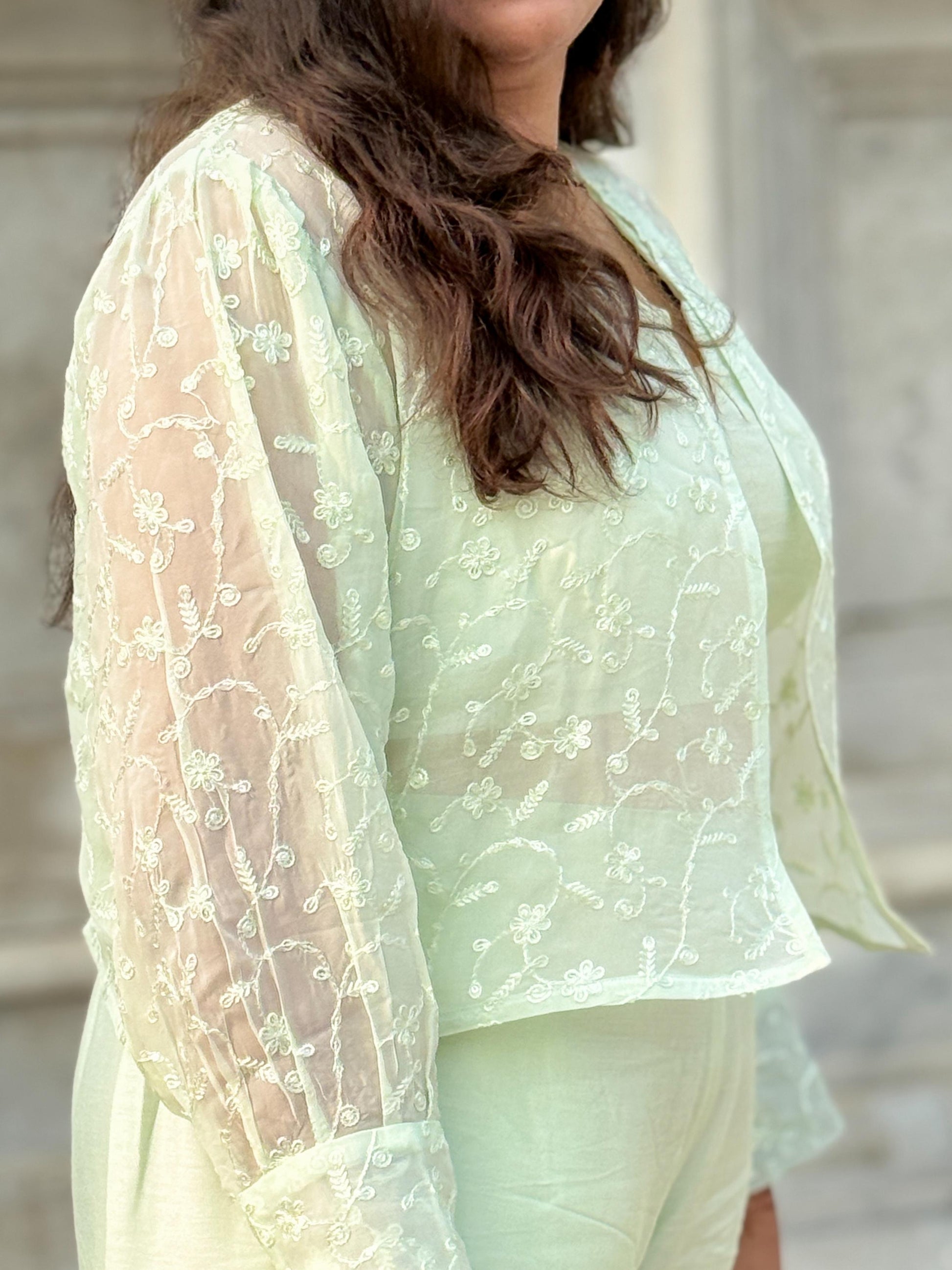 Stunning three-piece set is crafted for effortless style. The set includes a Muslin Crop Top and Wide-Leg Palazzo Pants, paired with an exquisite Organza Embroidered Shrug. The beautiful pastel mint color and lightweight fabrics make it the perfect Contemporary Festive Ensemble.